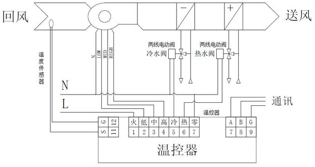 雙管冷熱組合系統(tǒng)由溫度控制器、風(fēng)機盤管和電動閥組成。。根據(jù)不同的應(yīng)用系統(tǒng),電動閥有雙通閥和三通閥。。當(dāng)系統(tǒng)中未設(shè)置旁路時,選擇雙通閥;當(dāng)系統(tǒng)設(shè)置有旁路時,應(yīng)用三通,冷水/熱水在正常制冷或供熱過程中通過盤管回流,冷水/熱水通過旁路回流,并且當(dāng)不需要制冷或供熱時,不流經(jīng)盤管系統(tǒng)。電動閥根據(jù)不同的控制原理分為二線閥和三線閥。