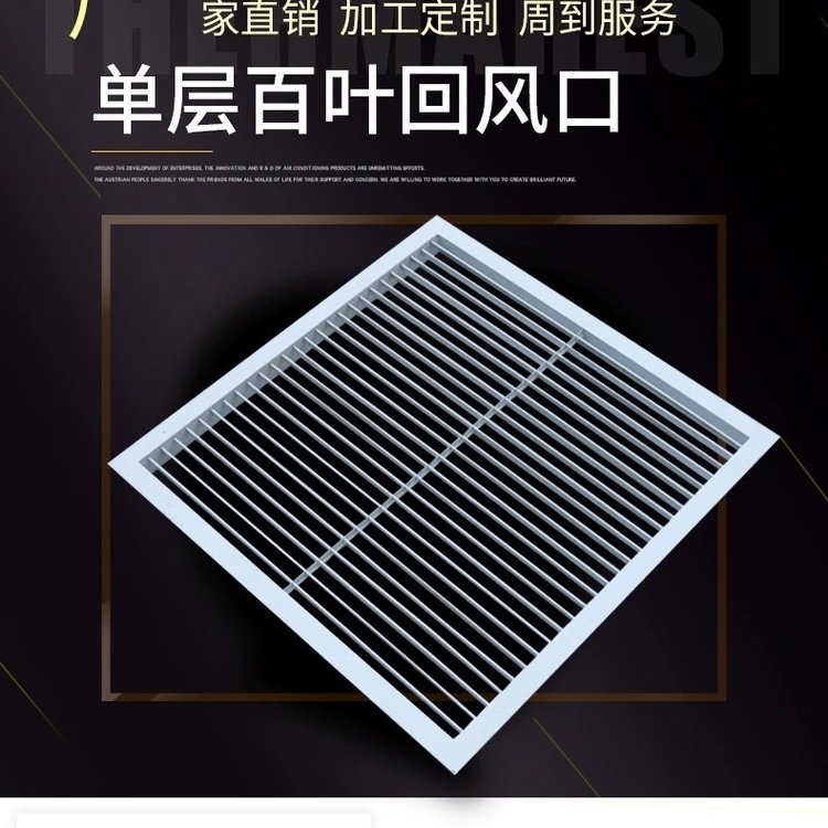 • 單層百葉風口(鋁合金) 單層可調百葉風口常用于管道中的吸、送風用,同時可根據實際情況配上人字閘(多葉對開調節閥),用以控制風量或安裝鋁合金……